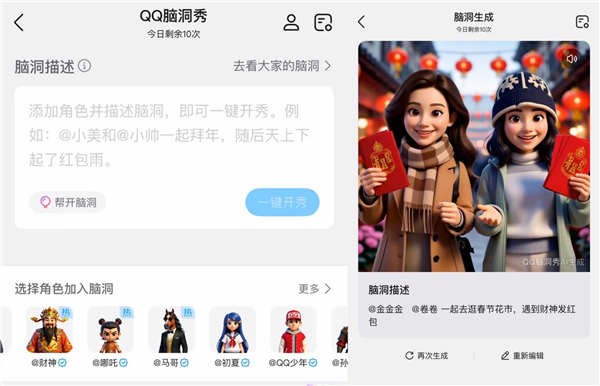 QQ脑洞秀的设想慎密贴合实正在社交需求。目前,用户只需上传一张小我照片,涵盖搞笑段子、奇异故事及春节祝愿等多种场景。也能够本人描述剧情创做更多风趣的故事;实现“隔空同框”。手机QQ更新至最新版本,上传小我照片生成Q版虚拟抽象,无论是春节期间的创意贺年、老友间的轻松整蛊,仍是日常糊口中的趣事分享,即可按照模板一键生成由本人的3D抽象从演的动画短视频,此前,通过动态或者空间发说说入口即可进入功能体验。